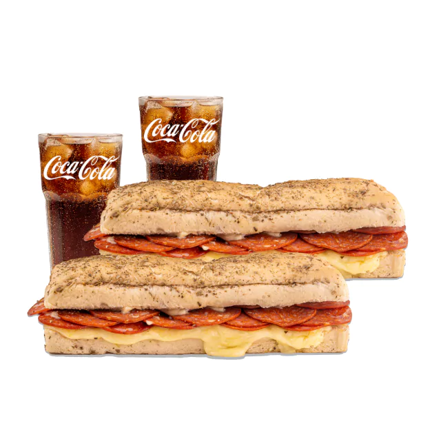 2 deliciosos sándwiches de 21cm de pepperoni y queso mozarella con pan ciabatta (o pan francés) prensado y salsa de ajo + 2 bebidas 250ml. 2 copas de salsa de 1.5 oz. No incluye valor del domicilio.