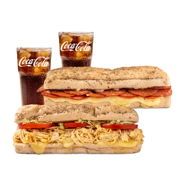 2 deliciosos sándwiches de 21cm, 1 de pollo con queso cheddar y 1 de pepperoni con queso mozarella, pan ciabatta (o pan francés) prensado y salsa de ajo + 2 bebidas 250ml. 2 copas de salsa de 1.5 oz. No incluye valor del domicilio.